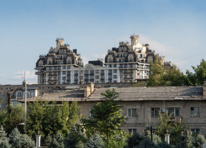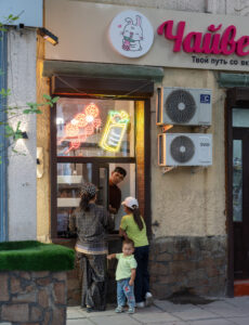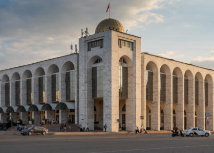 Zahlreiche Verwaltungsgebäude und Wohnblocks stammen aus der Zeit der Sowjetunion und zeigen typische Formen der sowjetischen Architektur. Gleichzeitig verändert sich die Stadt sichtbar: neue Wohnhäuser, Cafés und moderne Gebäude entstehen und geben Bischkek ein zunehmend junges und dynamisches Erscheinungsbild. Im Süden bilden die Berge des Tian Shan die beeindruckende Kulisse der Stadt.