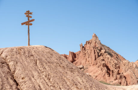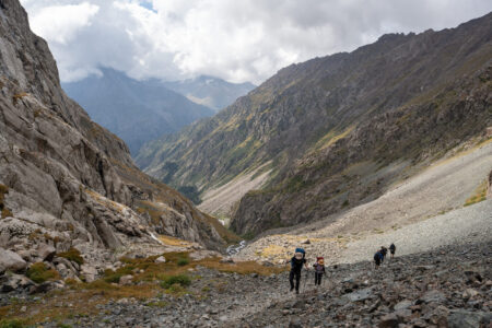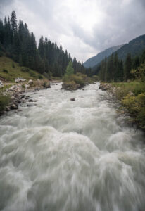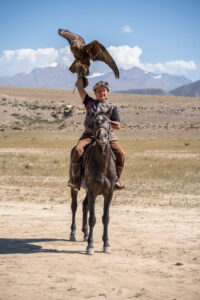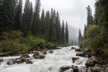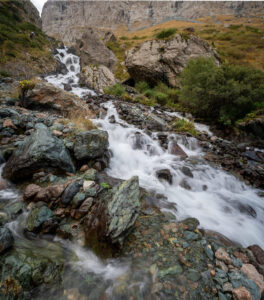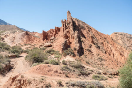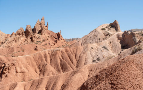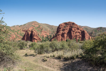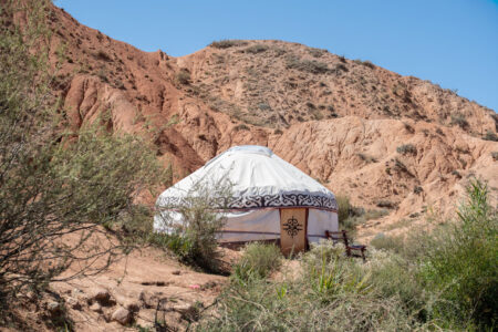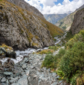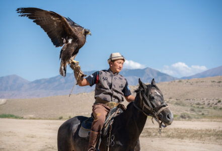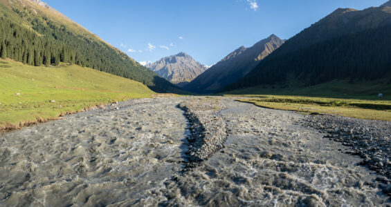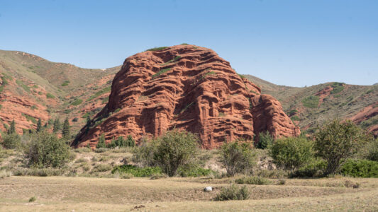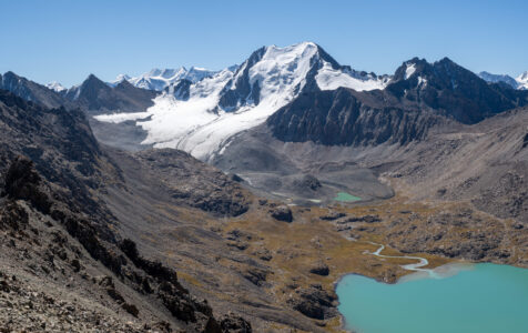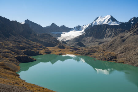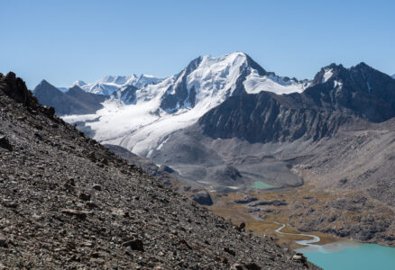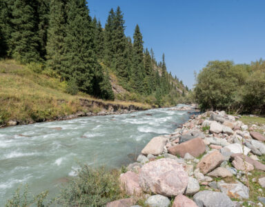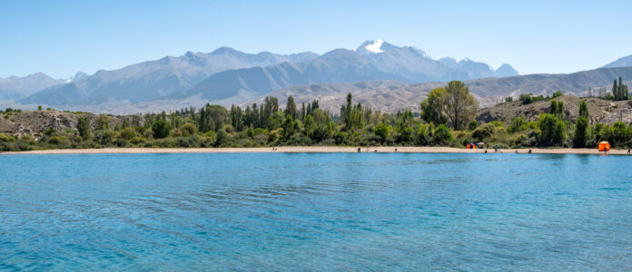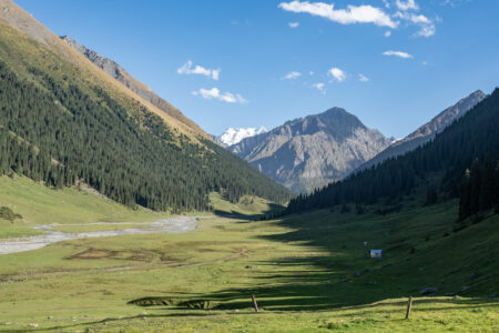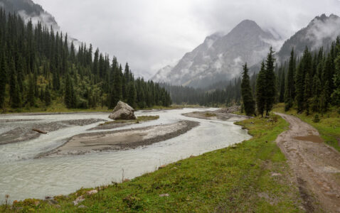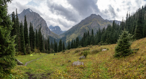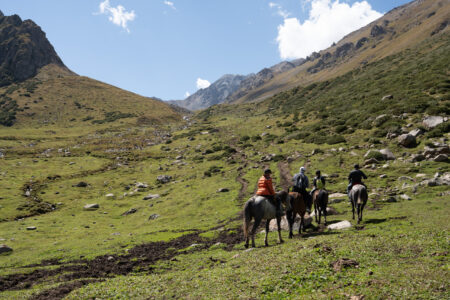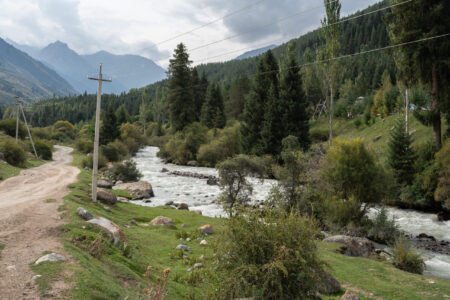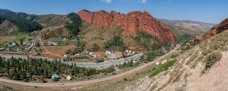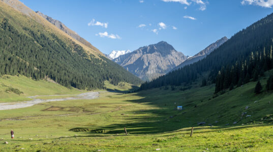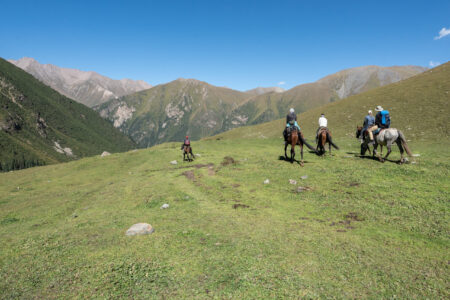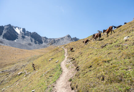 Der Osten Kirgisistans wird von den gewaltigen Gebirgslandschaften des Tian-Shan geprägt. Dieses Hochgebirge gehört zu den größten Gebirgssystemen Zentralasiens und erstreckt sich über mehrere tausend Kilometer. Viele Gipfel erreichen Höhen von über 5.000 Metern, einige sogar über 7.000 Meter. Zwischen den mächtigen Bergketten liegen weite Täler, Hochalmen und zahlreiche Hochgebirgsseen.