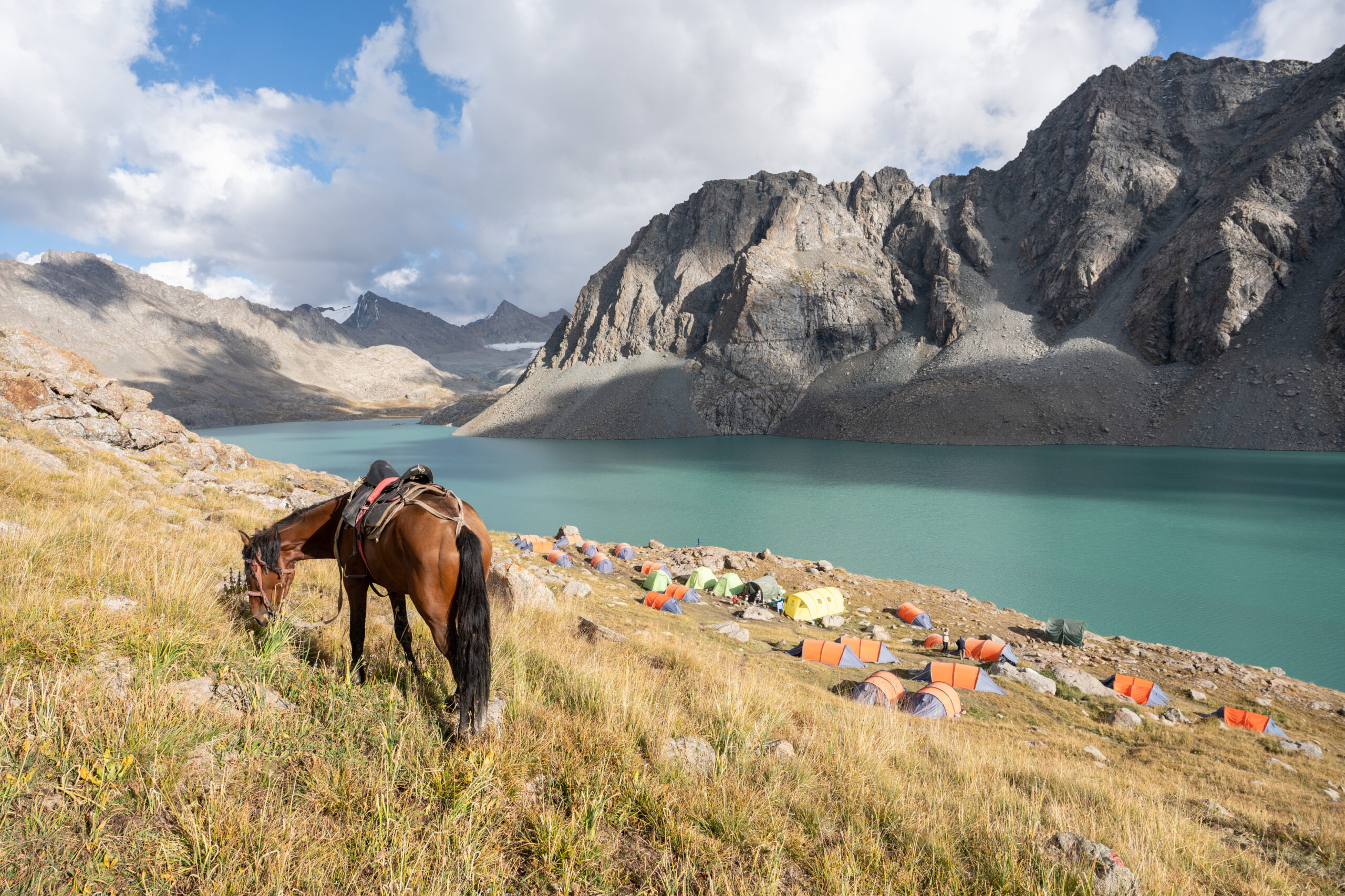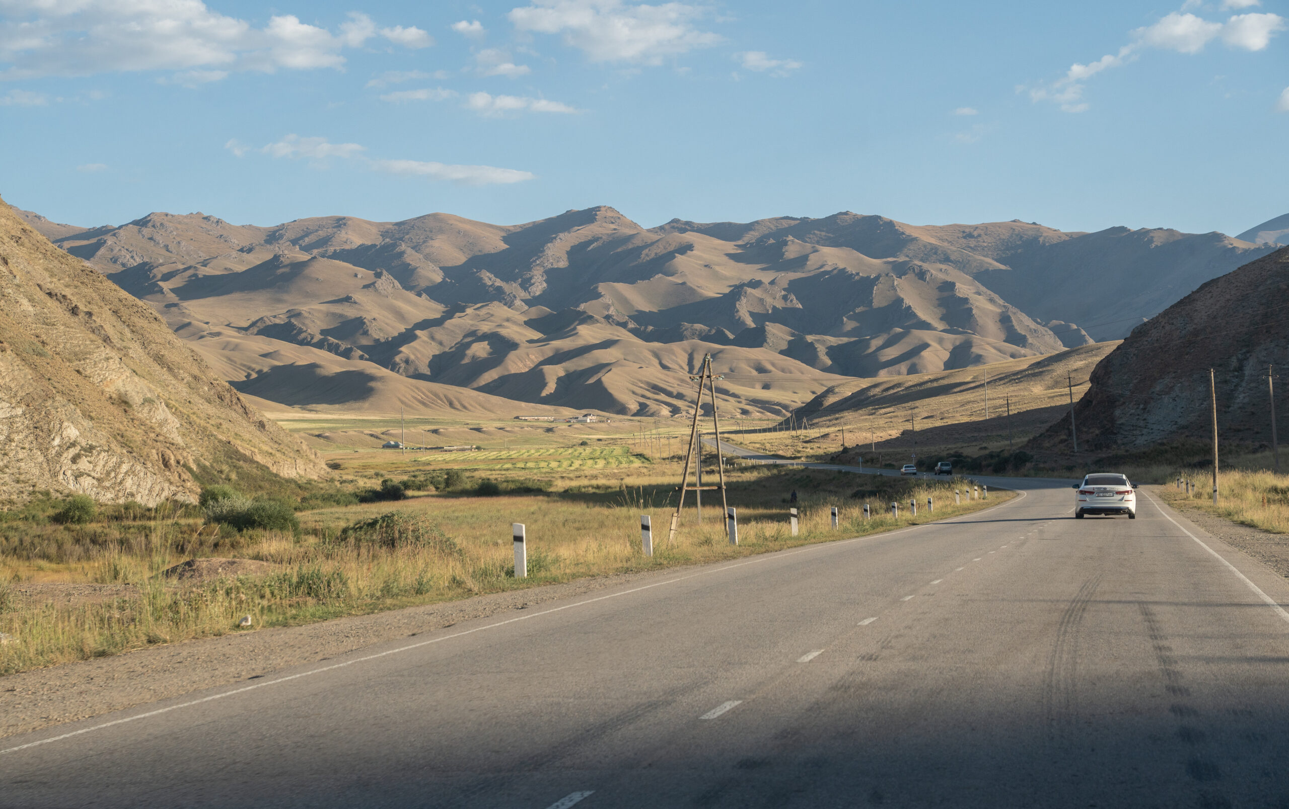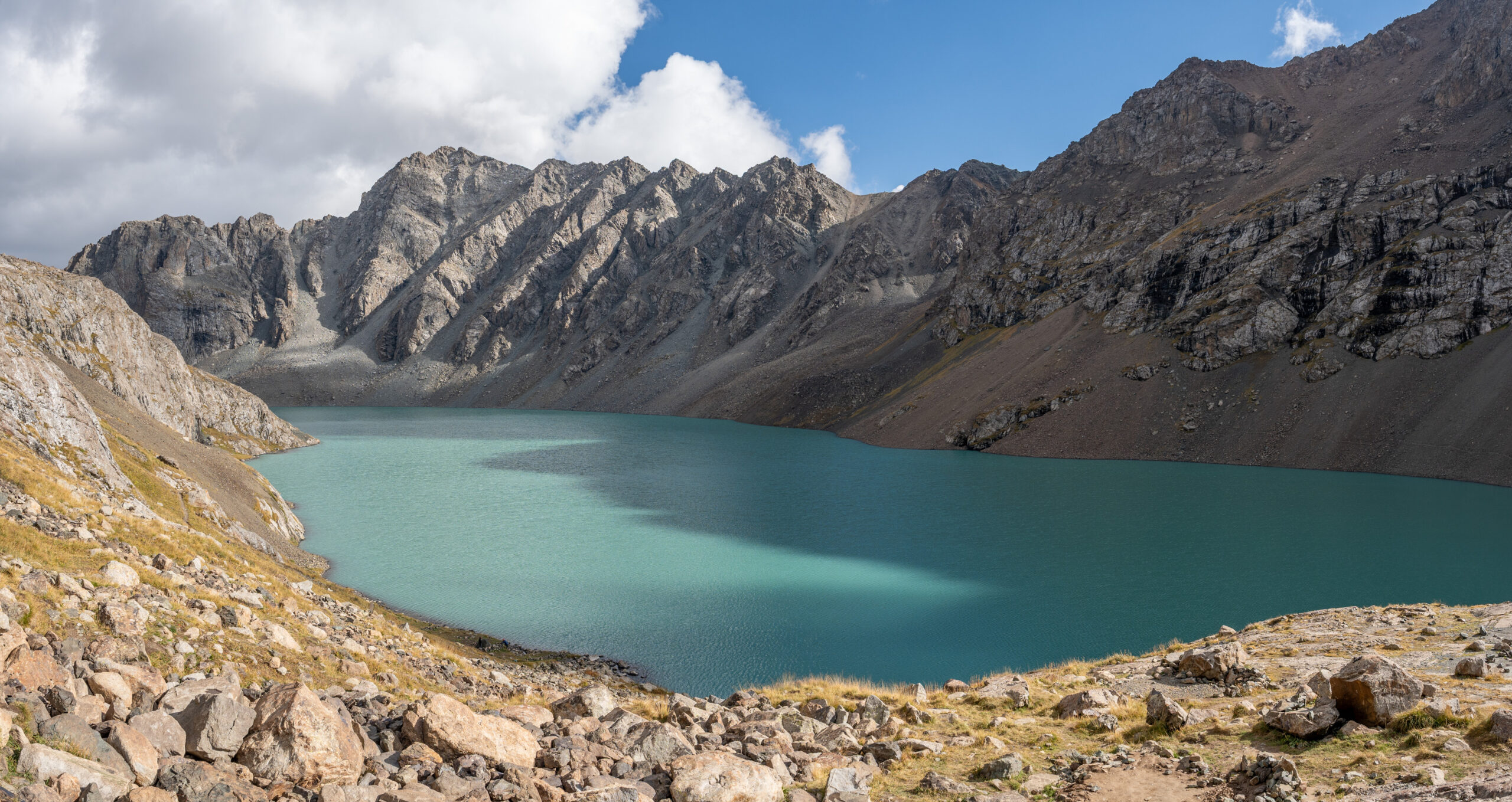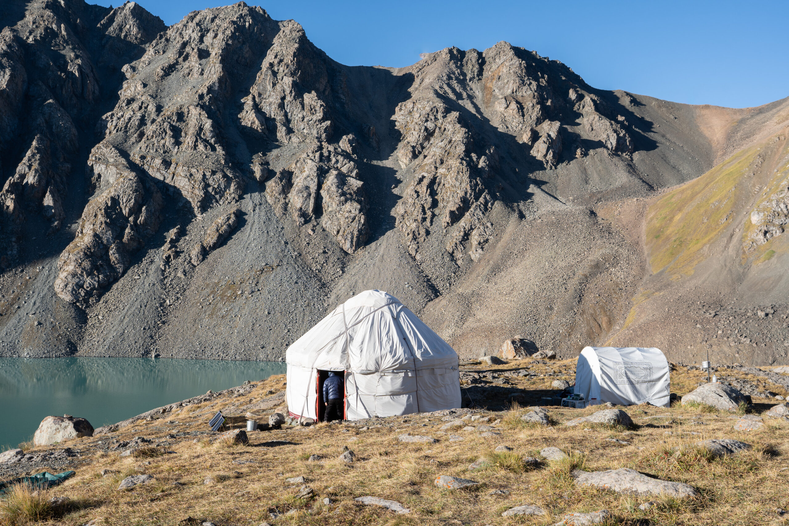 Der Osten Kirgisistans wird von den gewaltigen Gebirgslandschaften des Tian-Shan geprägt. Dieses Hochgebirge gehört zu den größten Gebirgssystemen Zentralasiens und erstreckt sich über mehrere tausend Kilometer. Viele Gipfel erreichen Höhen von über 5.000 Metern, einige sogar über 7.000 Meter. Zwischen den mächtigen Bergketten liegen weite Täler, Hochalmen und zahlreiche Hochgebirgsseen.