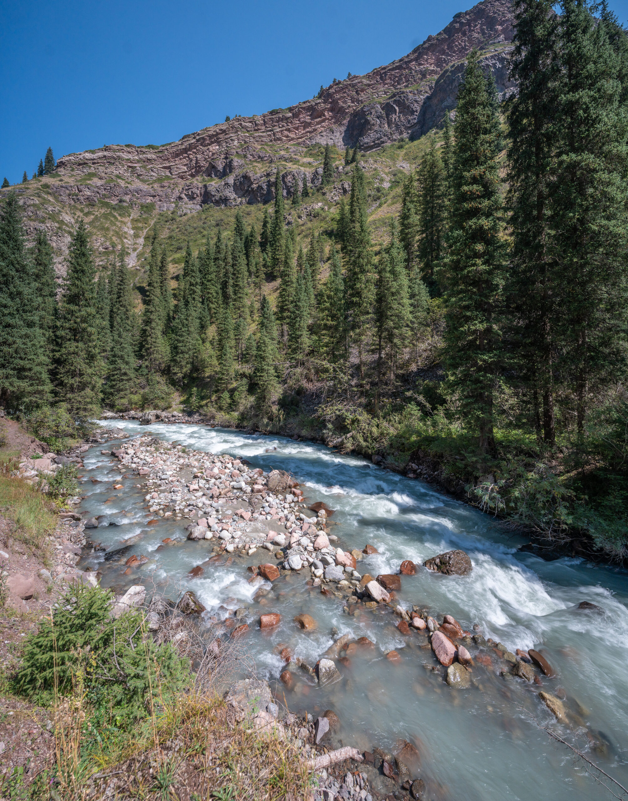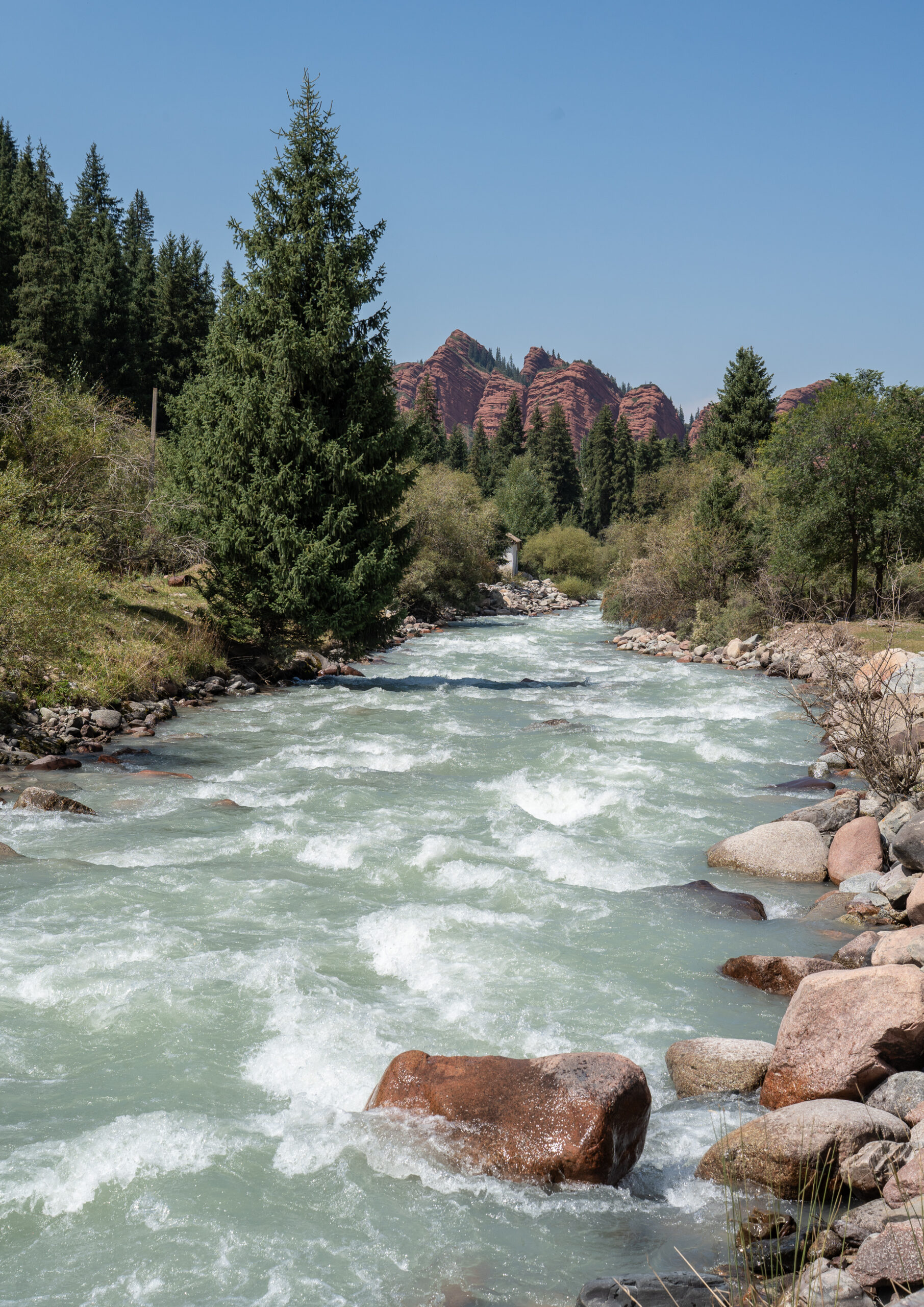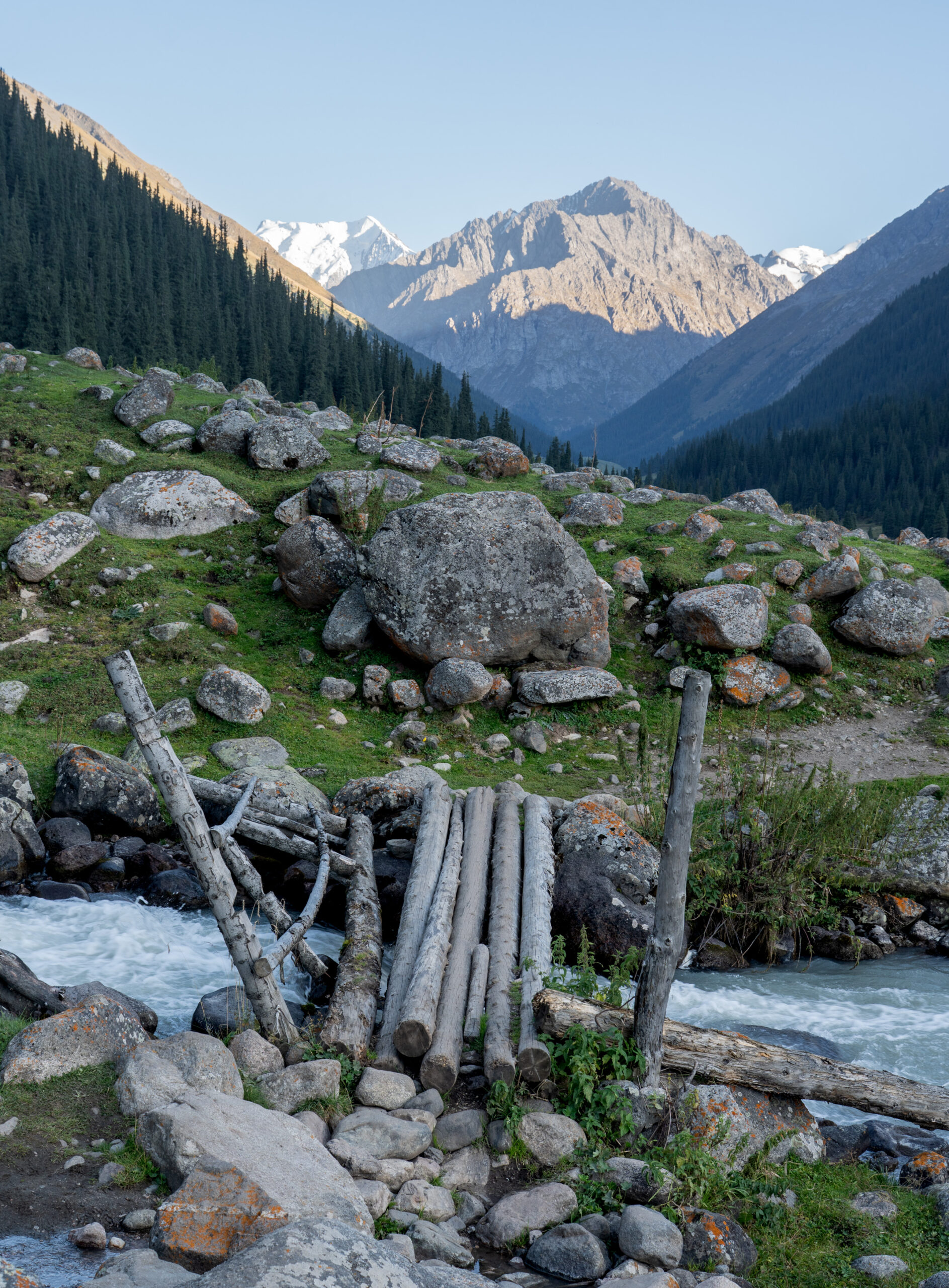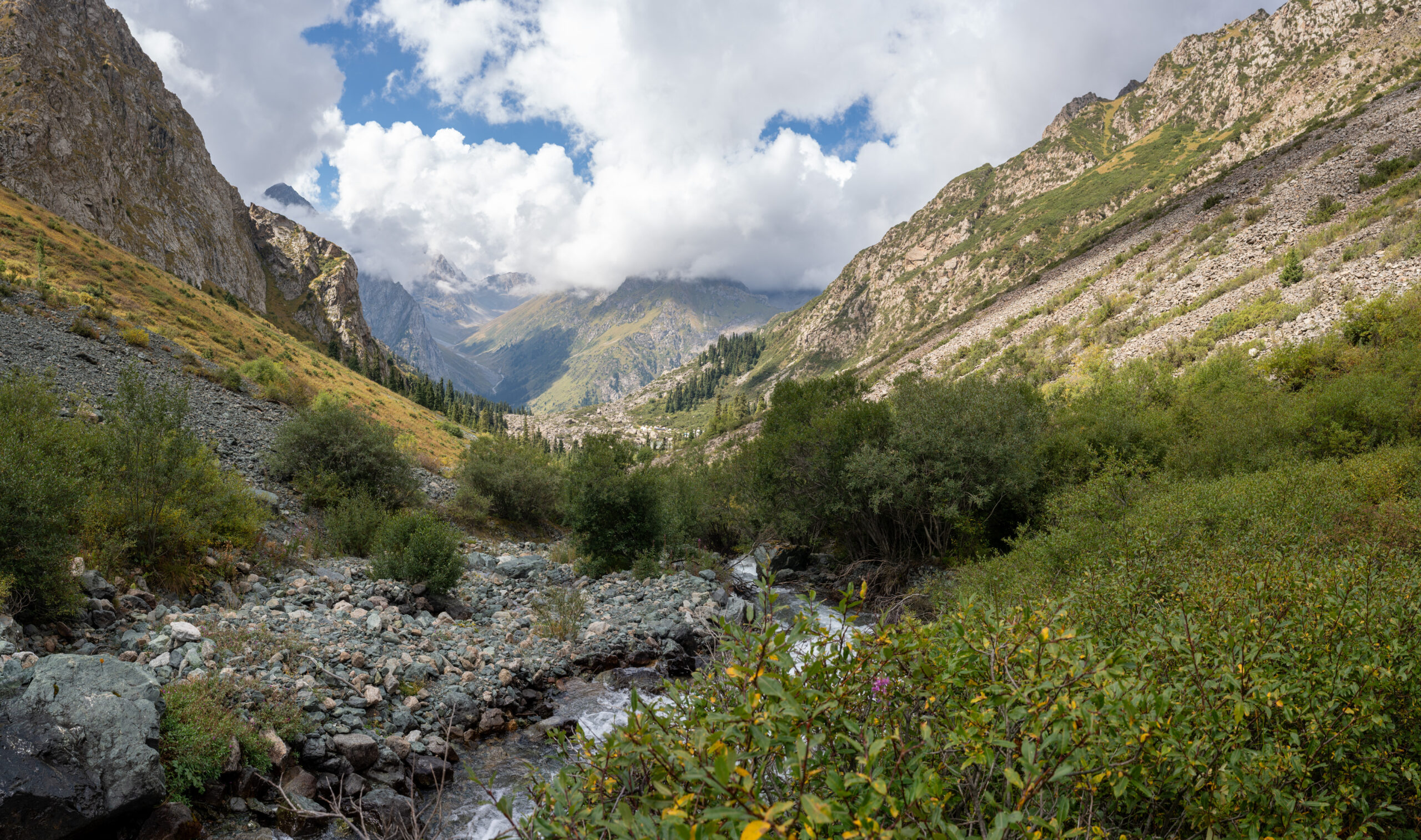 Der Osten Kirgisistans wird von den gewaltigen Gebirgslandschaften des Tian-Shan geprägt. Dieses Hochgebirge gehört zu den größten Gebirgssystemen Zentralasiens und erstreckt sich über mehrere tausend Kilometer. Viele Gipfel erreichen Höhen von über 5.000 Metern, einige sogar über 7.000 Meter. Zwischen den mächtigen Bergketten liegen weite Täler, Hochalmen und zahlreiche Hochgebirgsseen.
