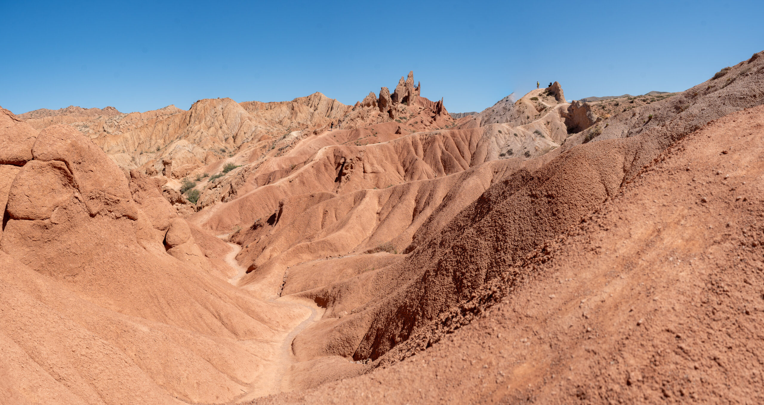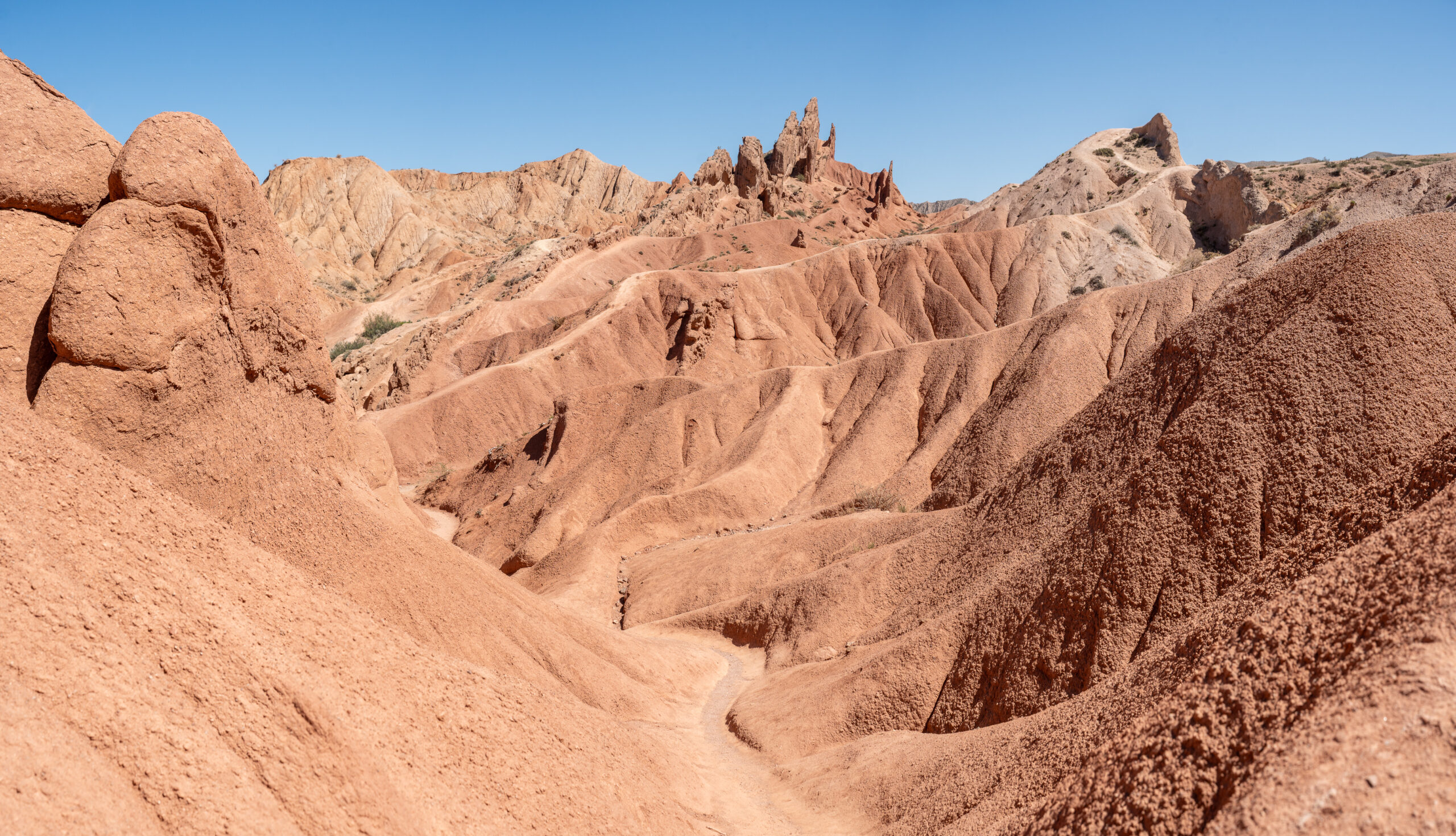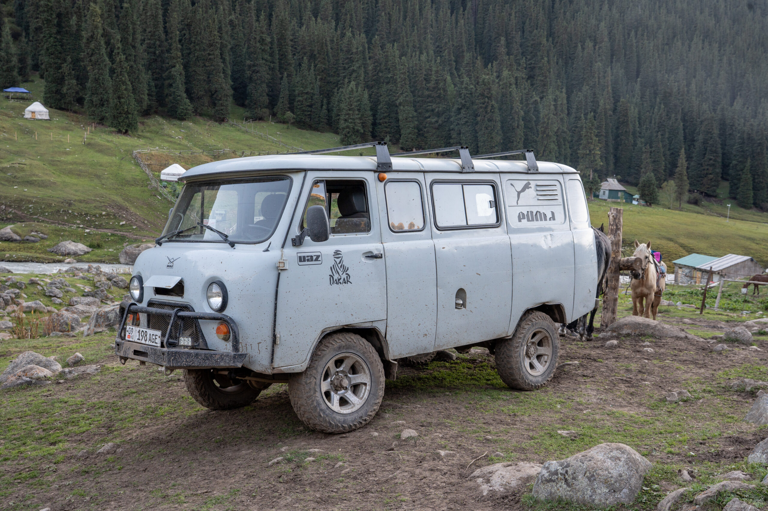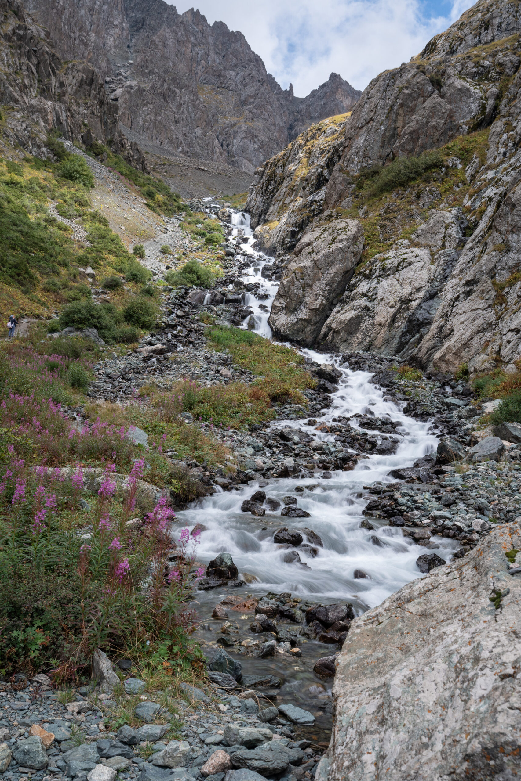 Der Osten Kirgisistans wird von den gewaltigen Gebirgslandschaften des Tian-Shan geprägt. Dieses Hochgebirge gehört zu den größten Gebirgssystemen Zentralasiens und erstreckt sich über mehrere tausend Kilometer. Viele Gipfel erreichen Höhen von über 5.000 Metern, einige sogar über 7.000 Meter. Zwischen den mächtigen Bergketten liegen weite Täler, Hochalmen und zahlreiche Hochgebirgsseen.
