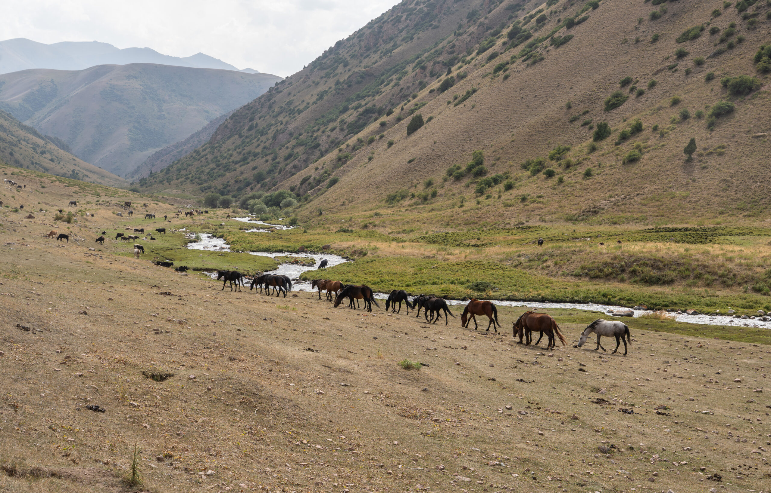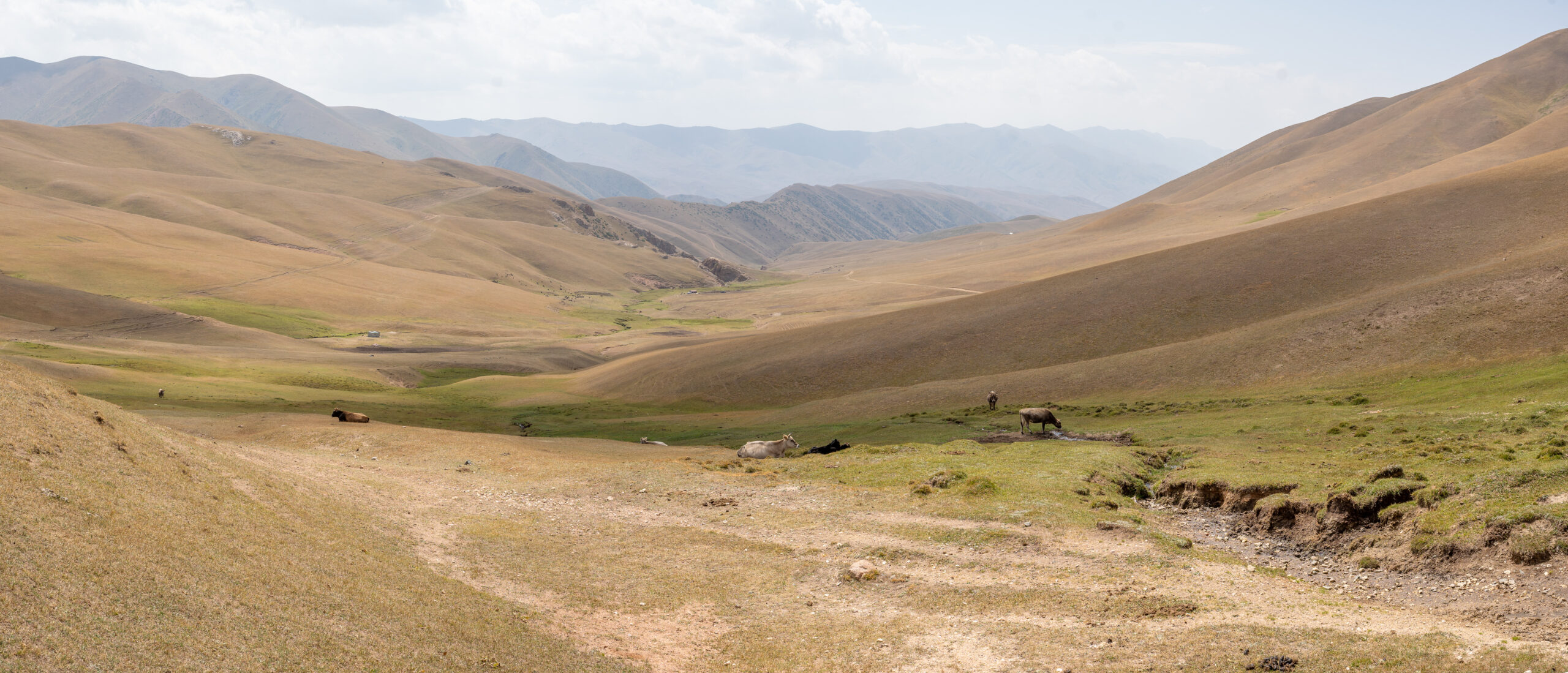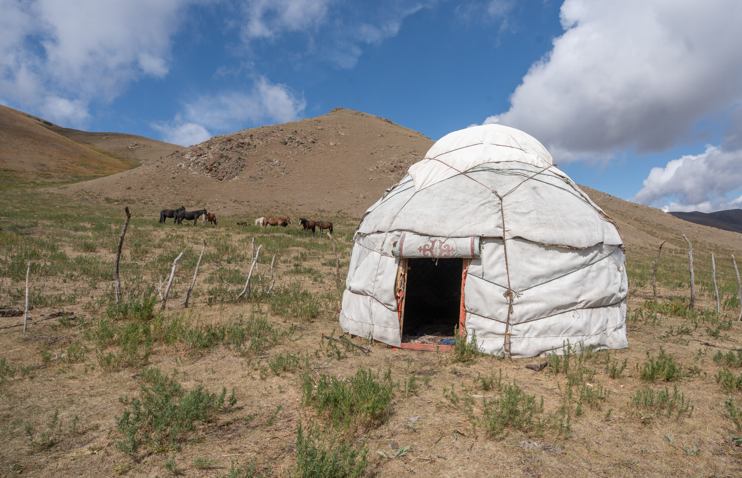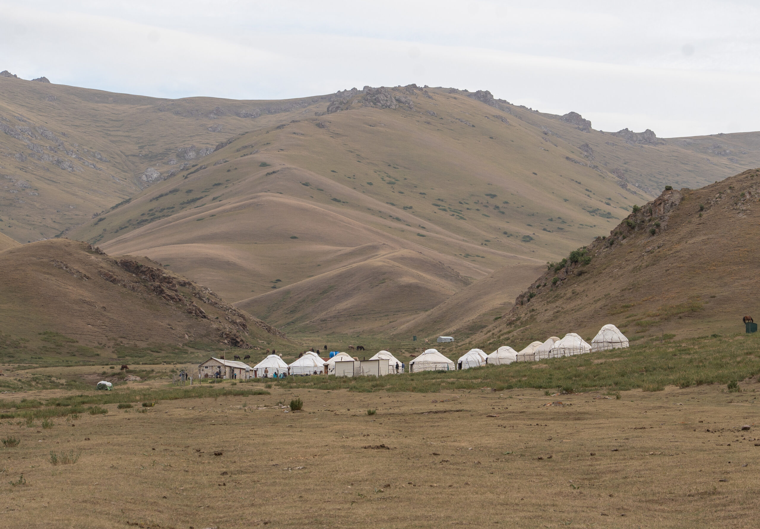 Zentralkirgistan ist eine weite Hochlandregion, die von offenen Hochebenen, sanften Bergketten und großen Sommerweiden geprägt wird. Viele Gebiete liegen auf über 2.000 Metern Höhe und werden im Sommer von Nomaden mit ihren Herden genutzt.