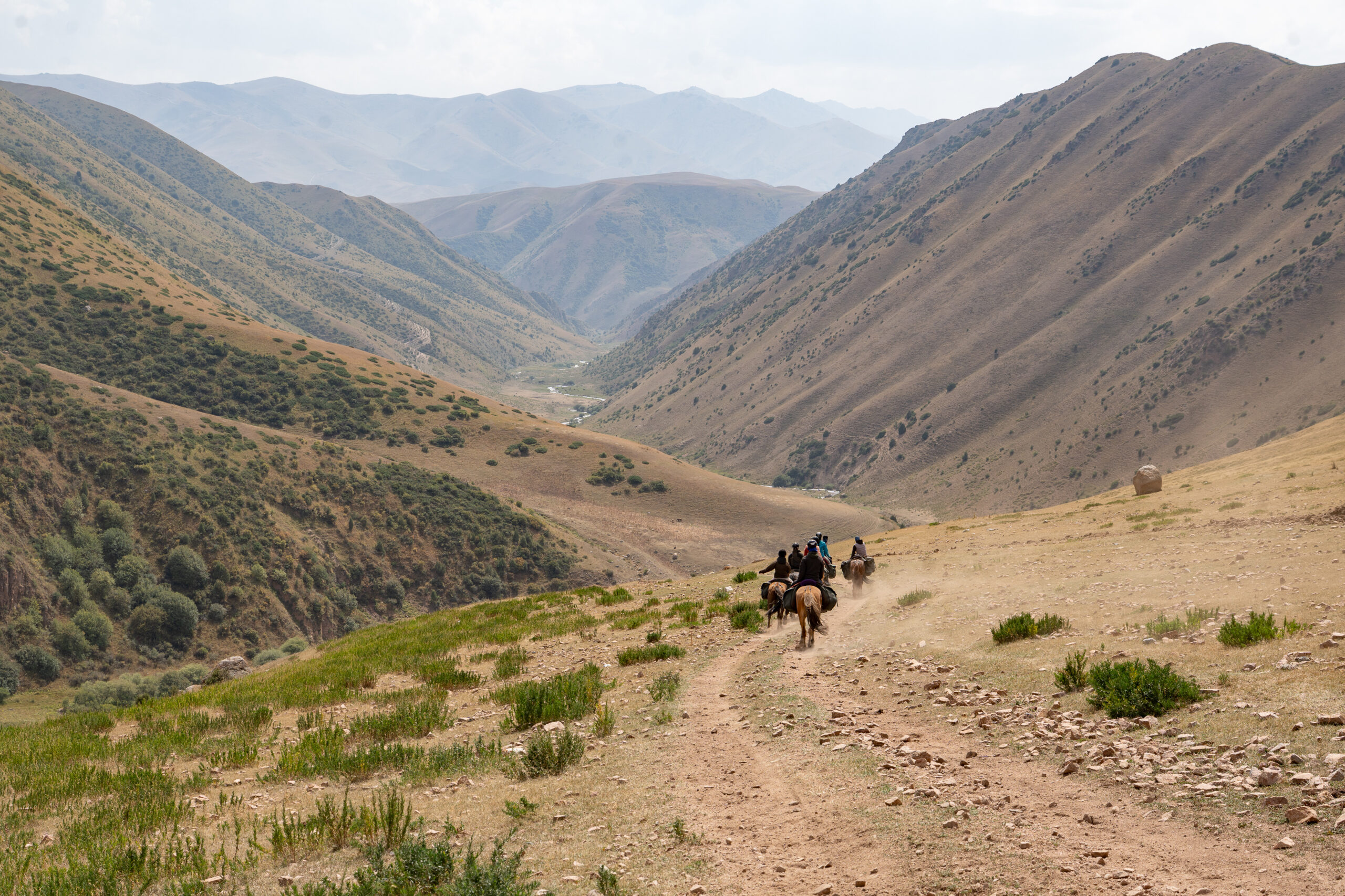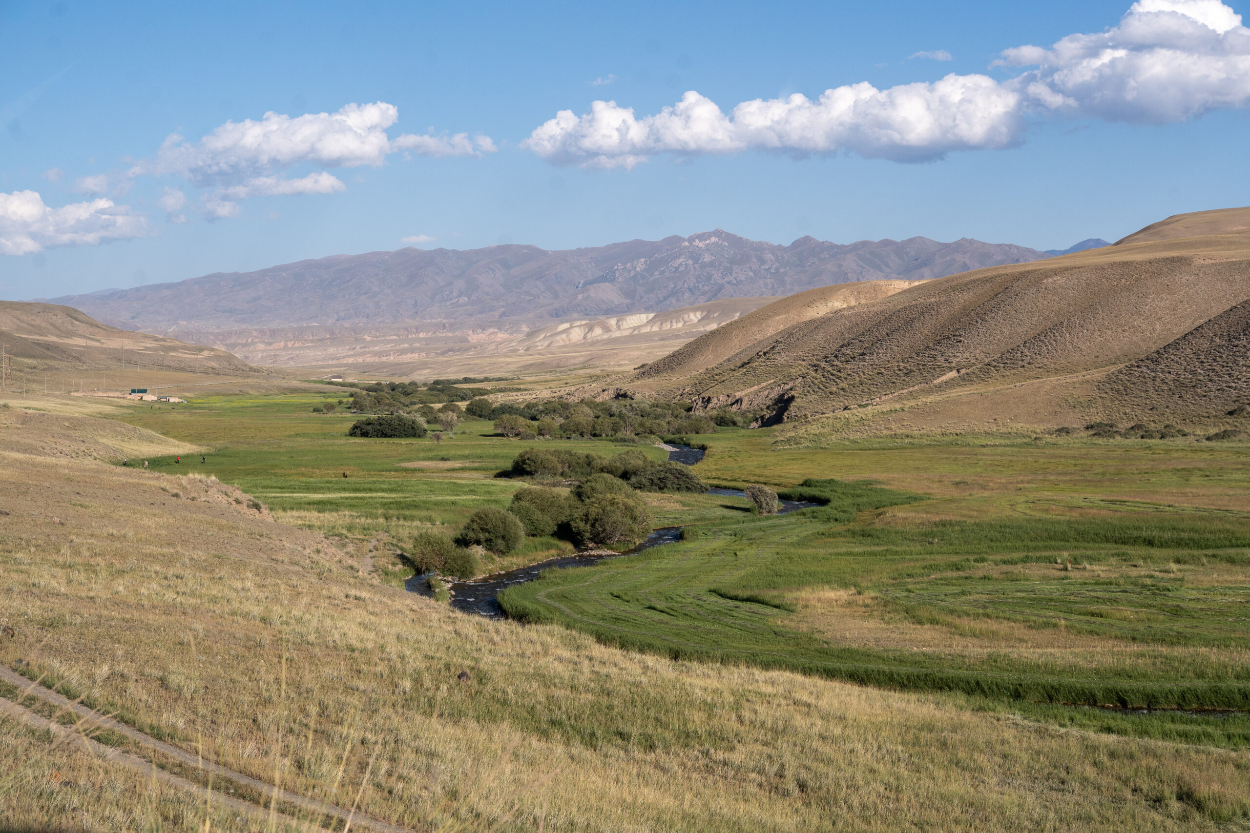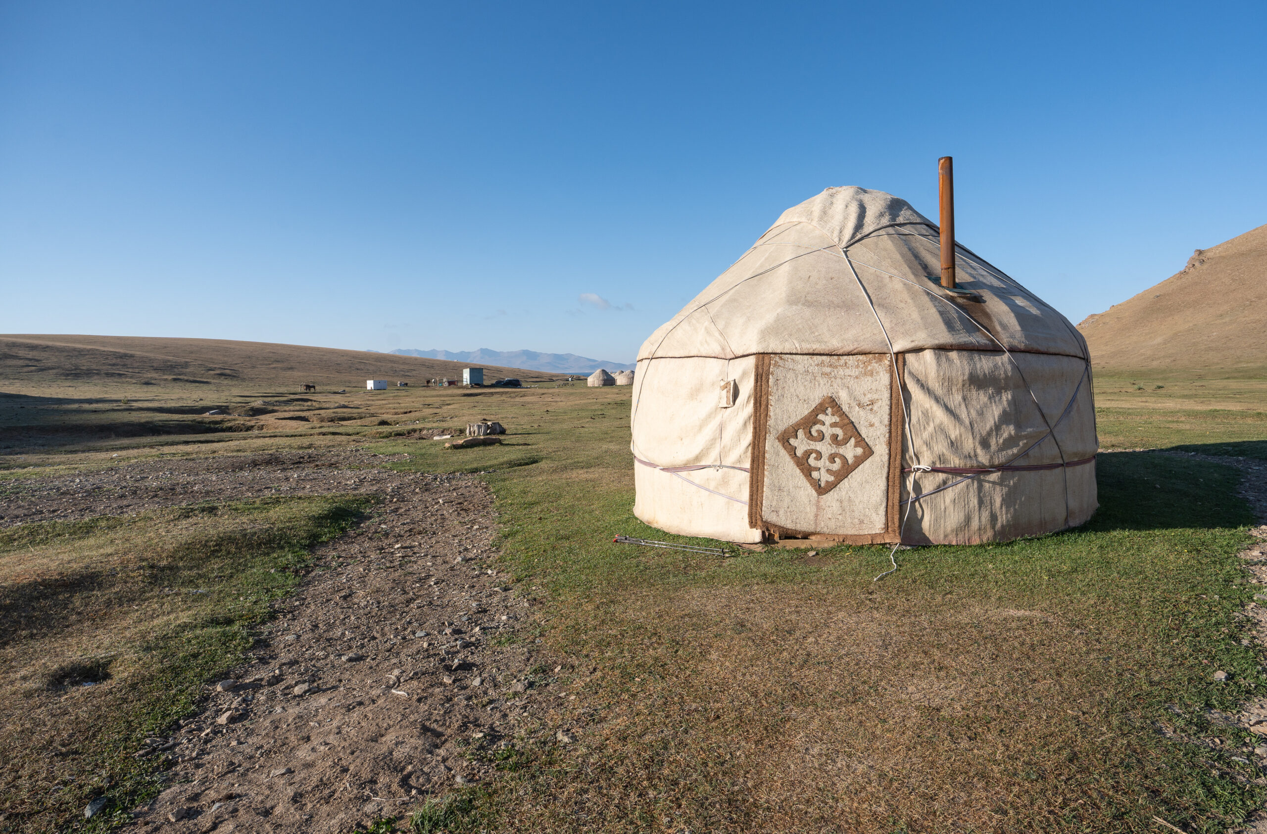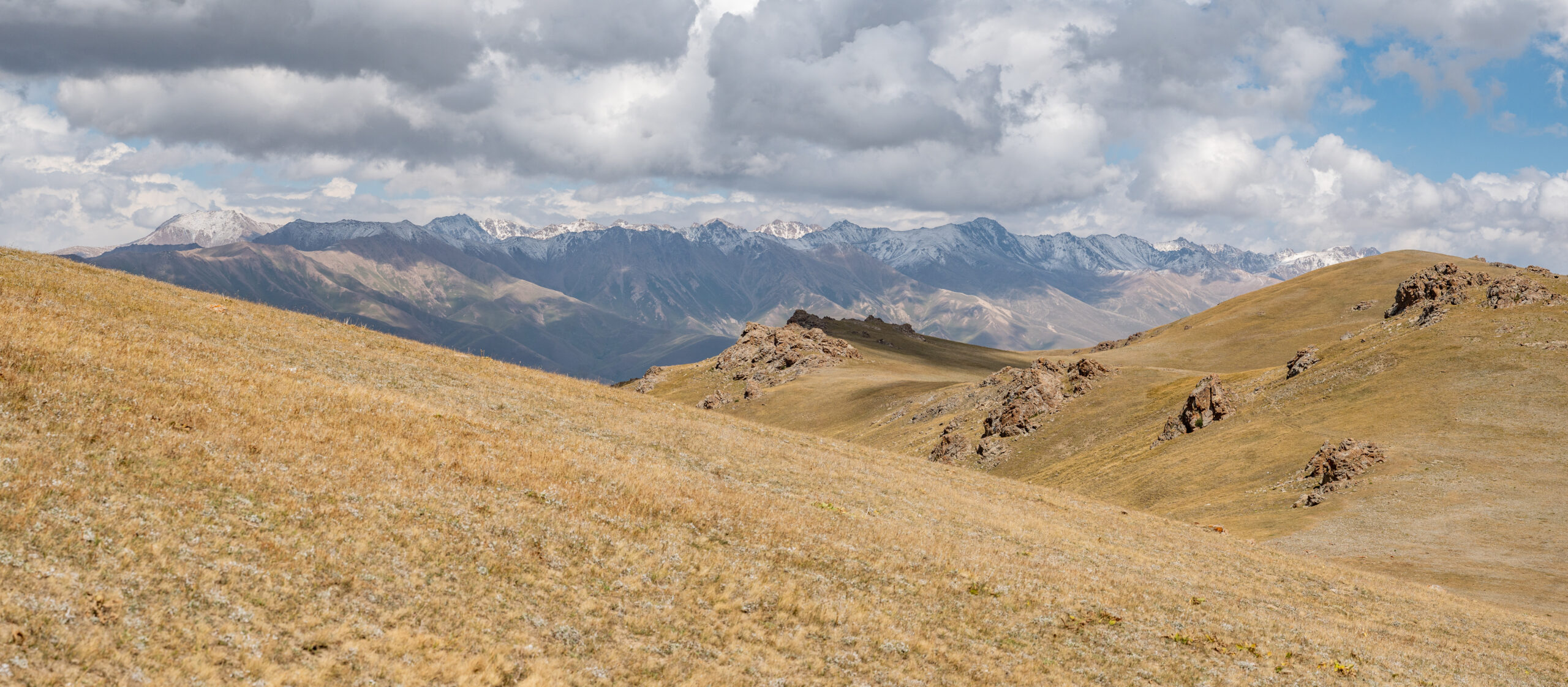 Zentralkirgistan ist eine weite Hochlandregion, die von offenen Hochebenen, sanften Bergketten und großen Sommerweiden geprägt wird. Viele Gebiete liegen auf über 2.000 Metern Höhe und werden im Sommer von Nomaden mit ihren Herden genutzt.