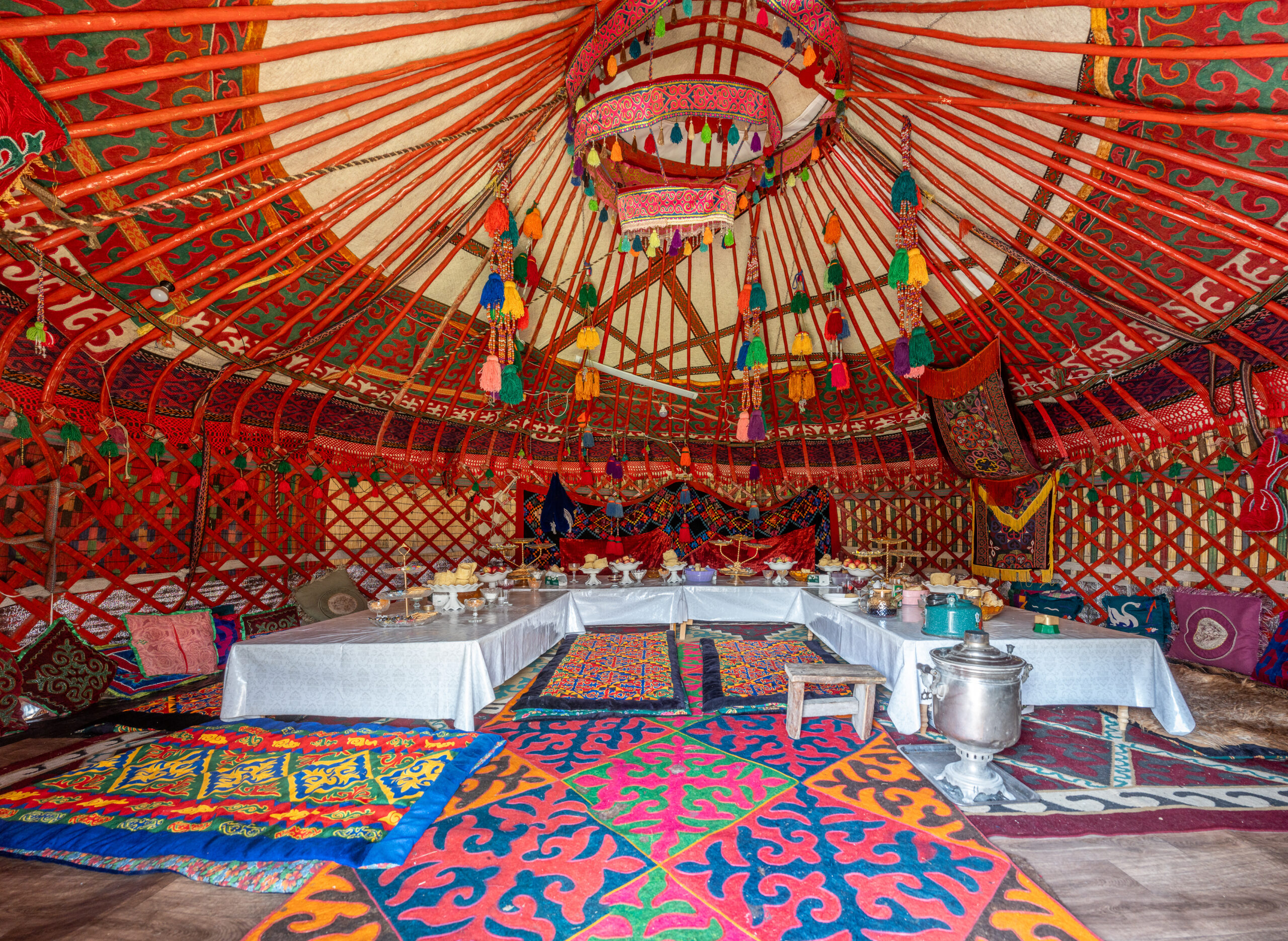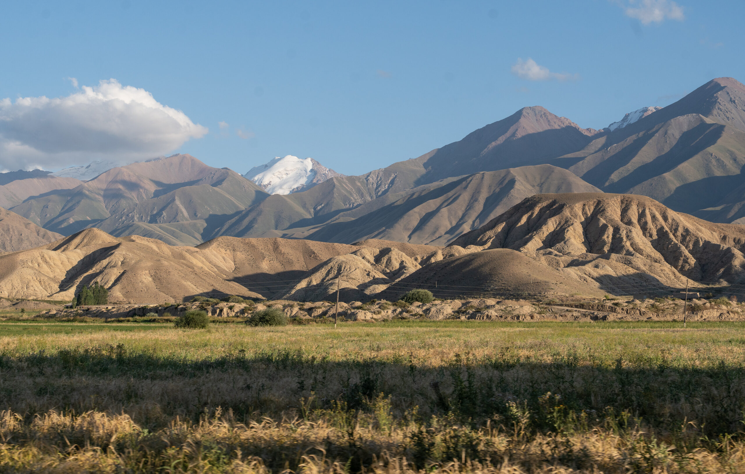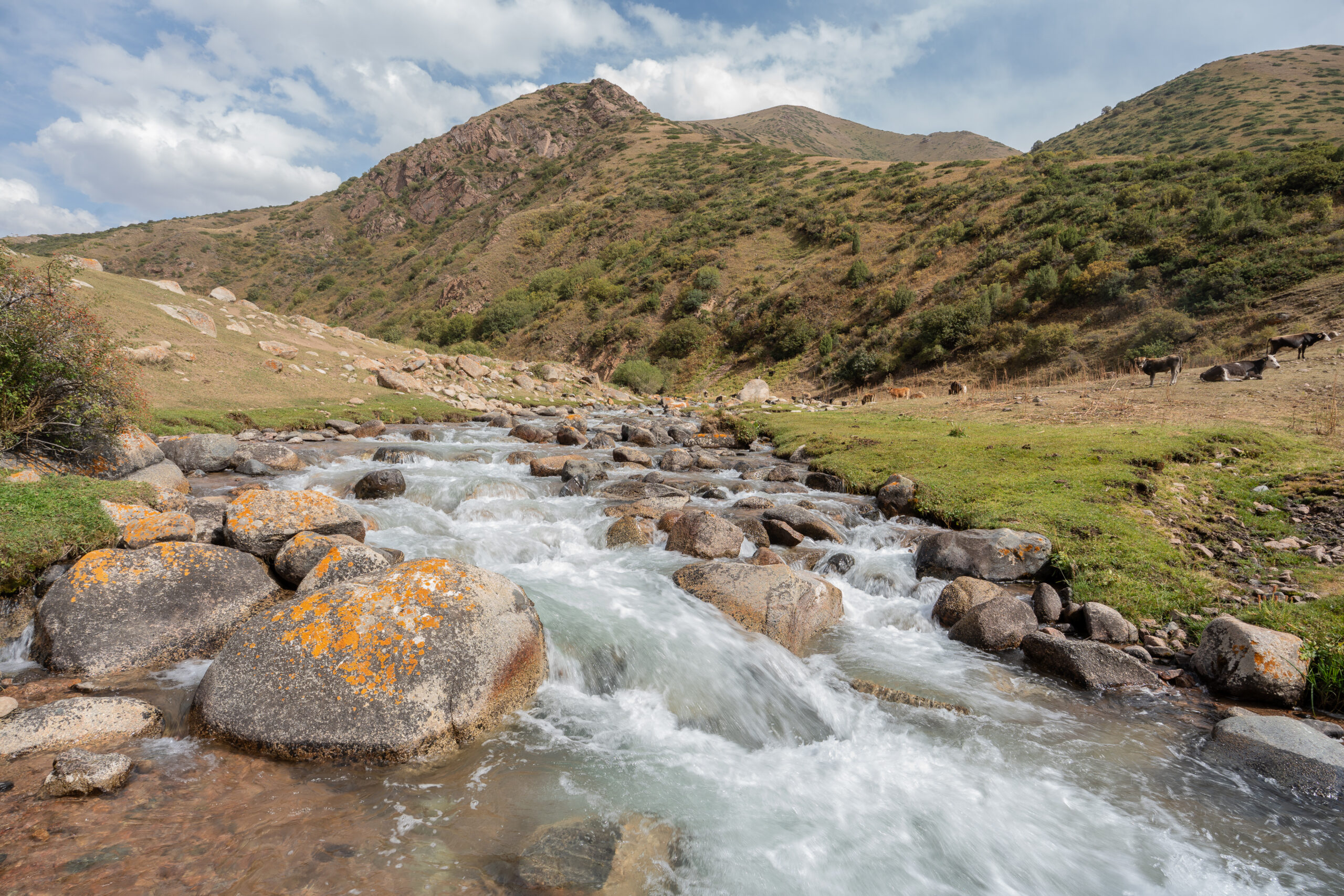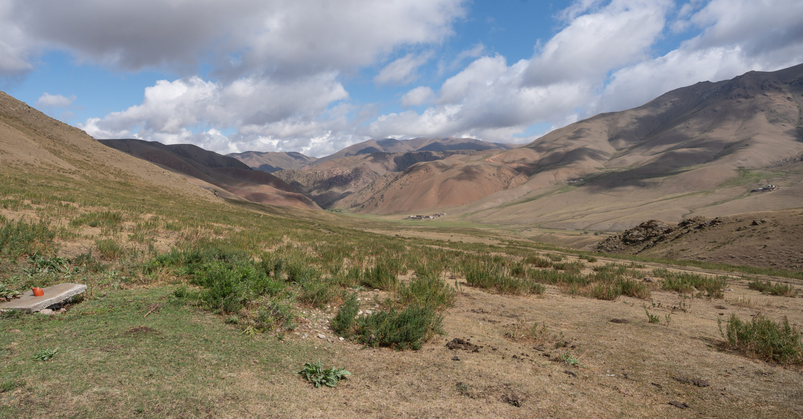 Zentralkirgistan ist eine weite Hochlandregion, die von offenen Hochebenen, sanften Bergketten und großen Sommerweiden geprägt wird. Viele Gebiete liegen auf über 2.000 Metern Höhe und werden im Sommer von Nomaden mit ihren Herden genutzt.